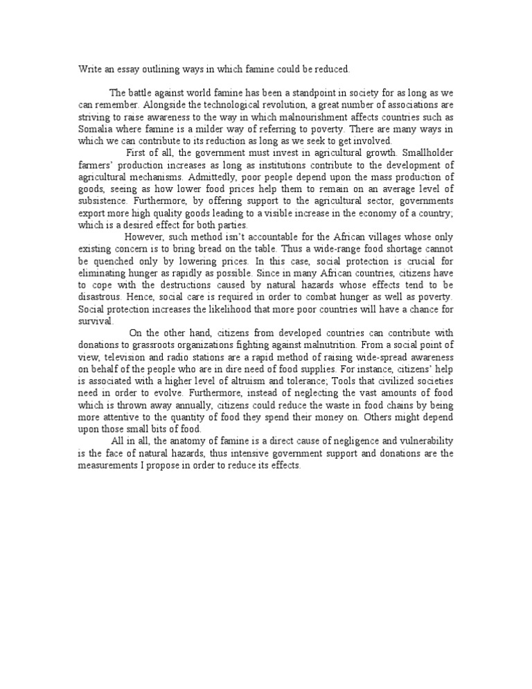 Famine is a global problem affected developing countries. The main causes of famine are low income and low developed economies, essay on famine. It is known that among the developed countries, increases in per-capita food production since the s have generally moved upward in tandem with increases in total food production. Among the developing countries, per-capita food production has generally lagged behind.